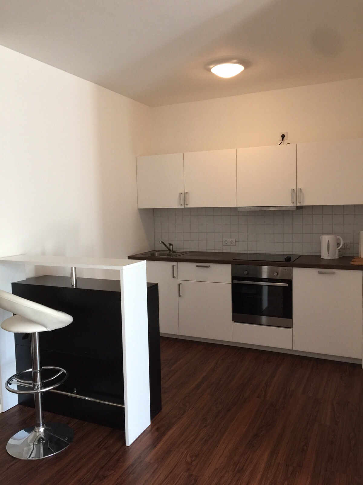A cozinha é um espetáculo! Muitos armários, um bar bem simpático e um fogão de primeira. No cantinho está a minha chaleira elétrica, muito boa para fazer um chá de manhã ou esquentar a água do arroz.