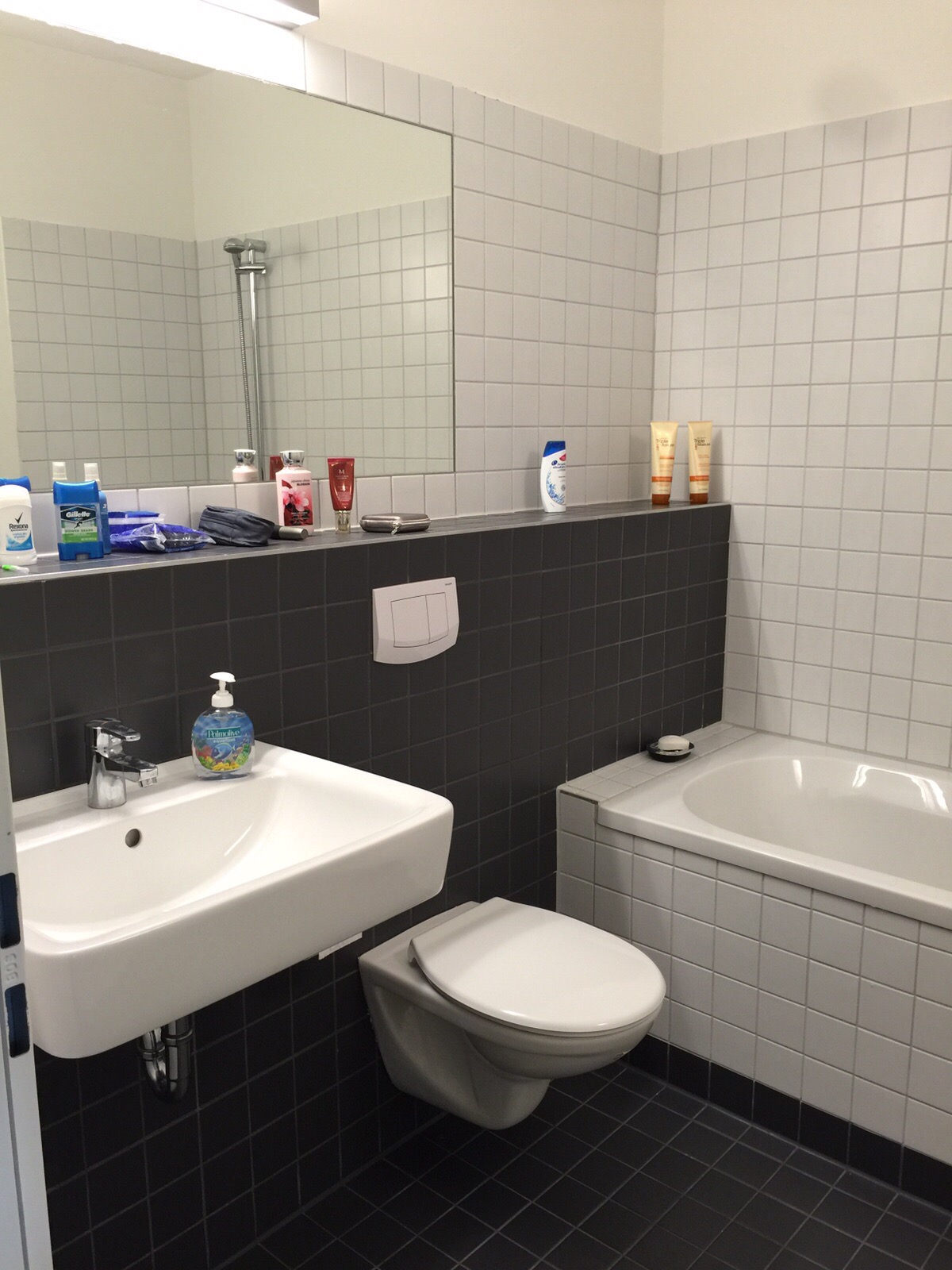 O banheiro é bem amplo e tem um secador de toalha. Muito útil no inverno! O chuveiro aqui fica dentro da banheira, seguindo a tradição alemã.