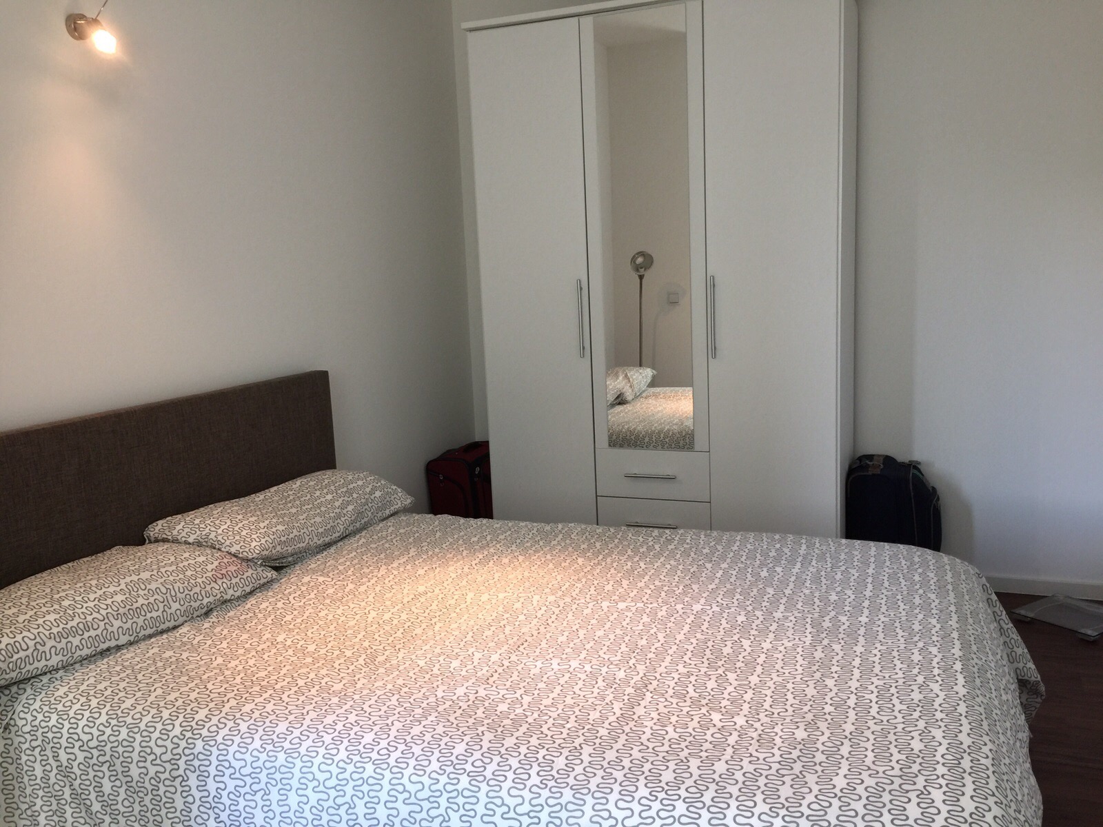 O quarto é muito bom. A cama é confortável e o armário é muito prático. No cantinho do quarto colocamos a balança para controlar o nosso peso. Tenho que maneirar no Kartoffel Salat!