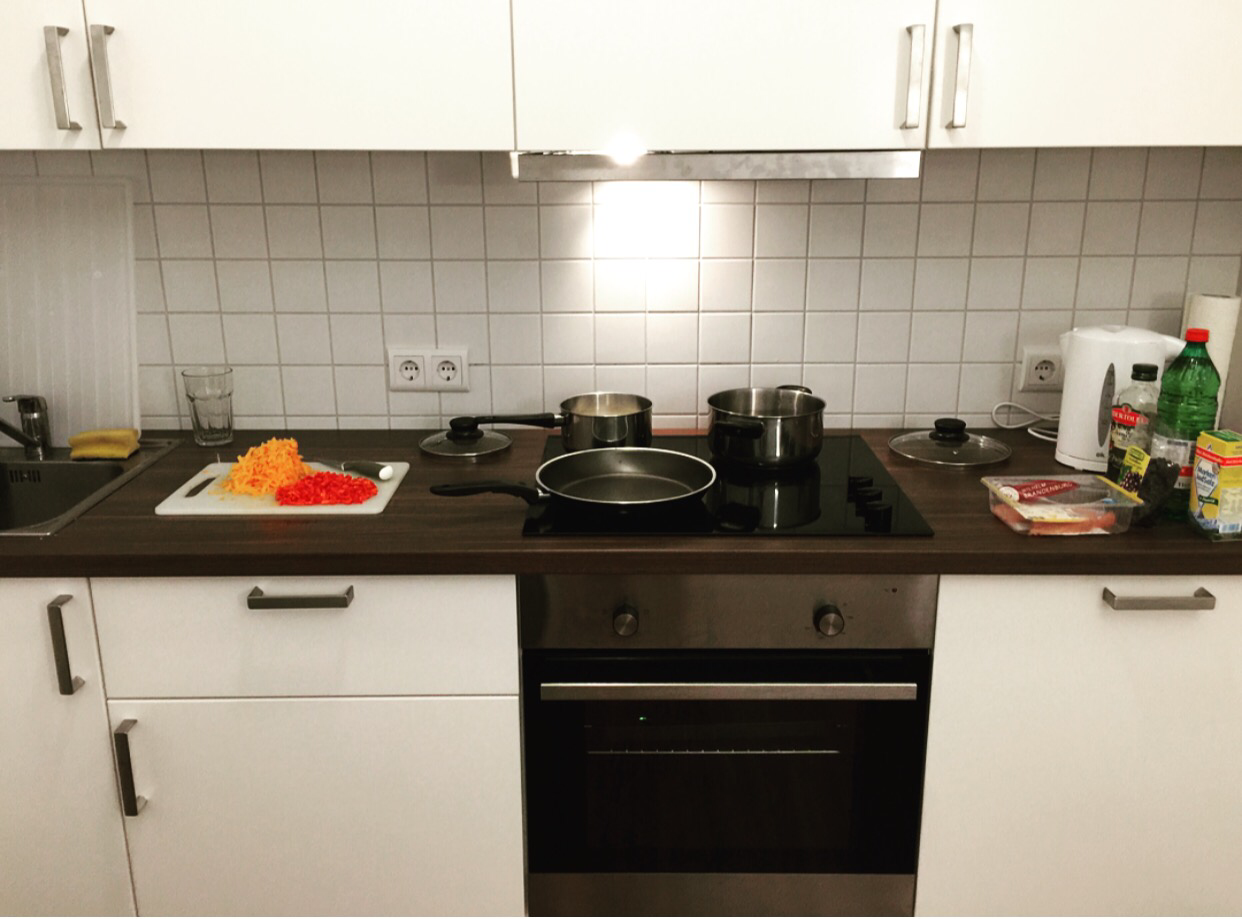 No lado esquerdo estão a cenoura e o pimentão que fiz hoje com uva passa e arroz integral. A cozinha do apartamento é boa, tem até um exaustor. A geladeira está na porta inferior do lado direito (ao lado do forno). Ela é pequena, mas cabe duas semanas de comida para duas pessoas. A geladeira aqui de casa sempre tem brócolis, champignon, cenoura, pimentão, cebola e alho. São os vegetais mais populares no supermercado junto com pepino, repolho e batata, obviamente.