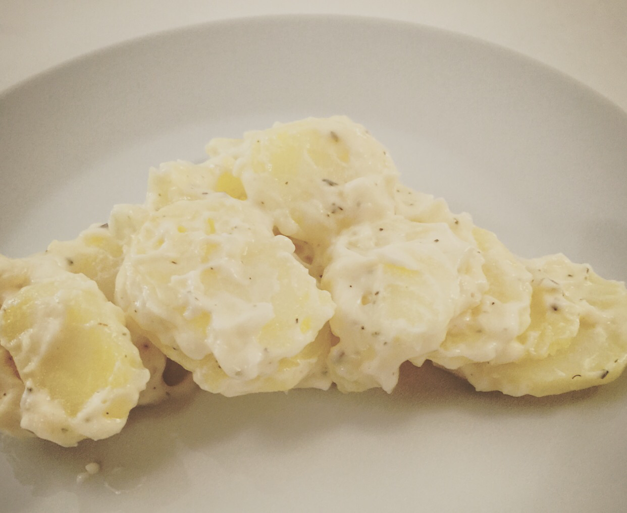 O acompanhamento do almoço de hoje foi Kartoffel Salat feita pelo Antenor! Acabei fazendo a salada do zero em vez de comprar o molho pronto. Usei uma maionese com 40% de iogurte, ervas, azeite e cebola. Cortei as batatas em rodelas, mantendo a tradição alemã. Ficou muito boa, não tão leve quanto a versão com o molho pronto, mas com o paladar bem similar ao da autêntica.