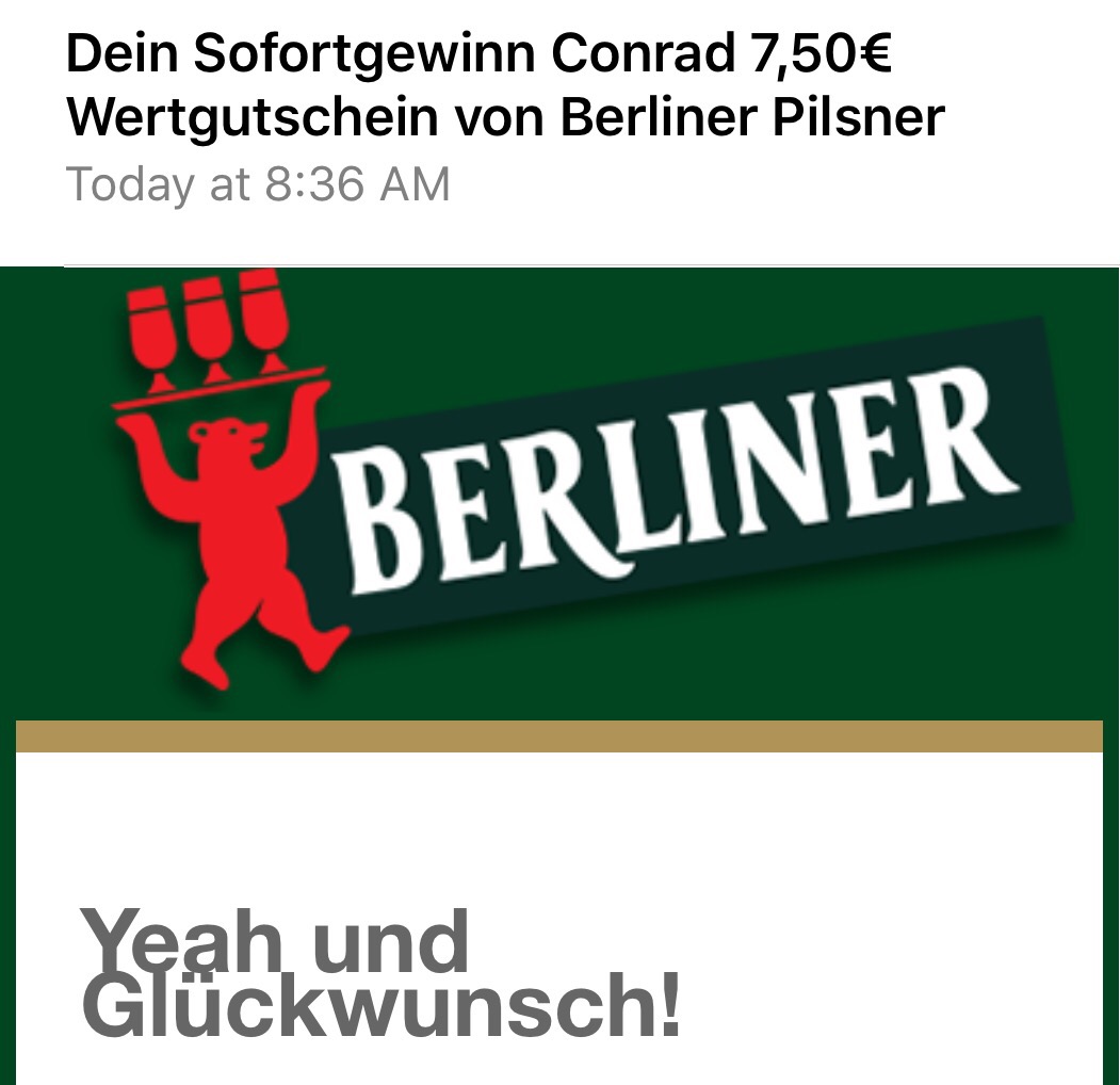 Hoje pela manhã cadastrei o código da tampinha da cerveja Berliner que tomei ontem e… Surpresa! Ganhei um cupom de €7,50 para gastar em uma loja de eletrônicos chamada Conrad.