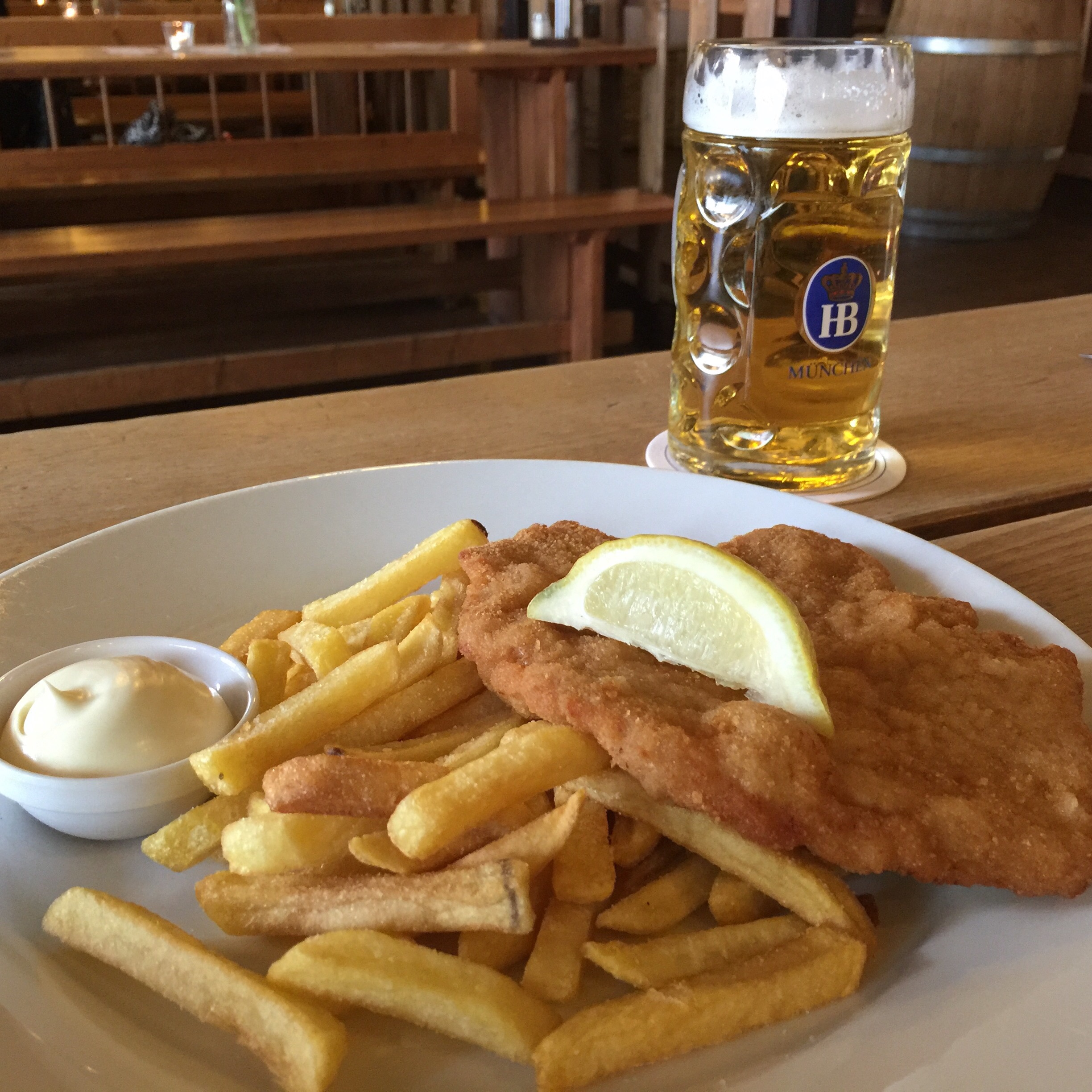 Schnitzel com cerveja na Hofbräu.
